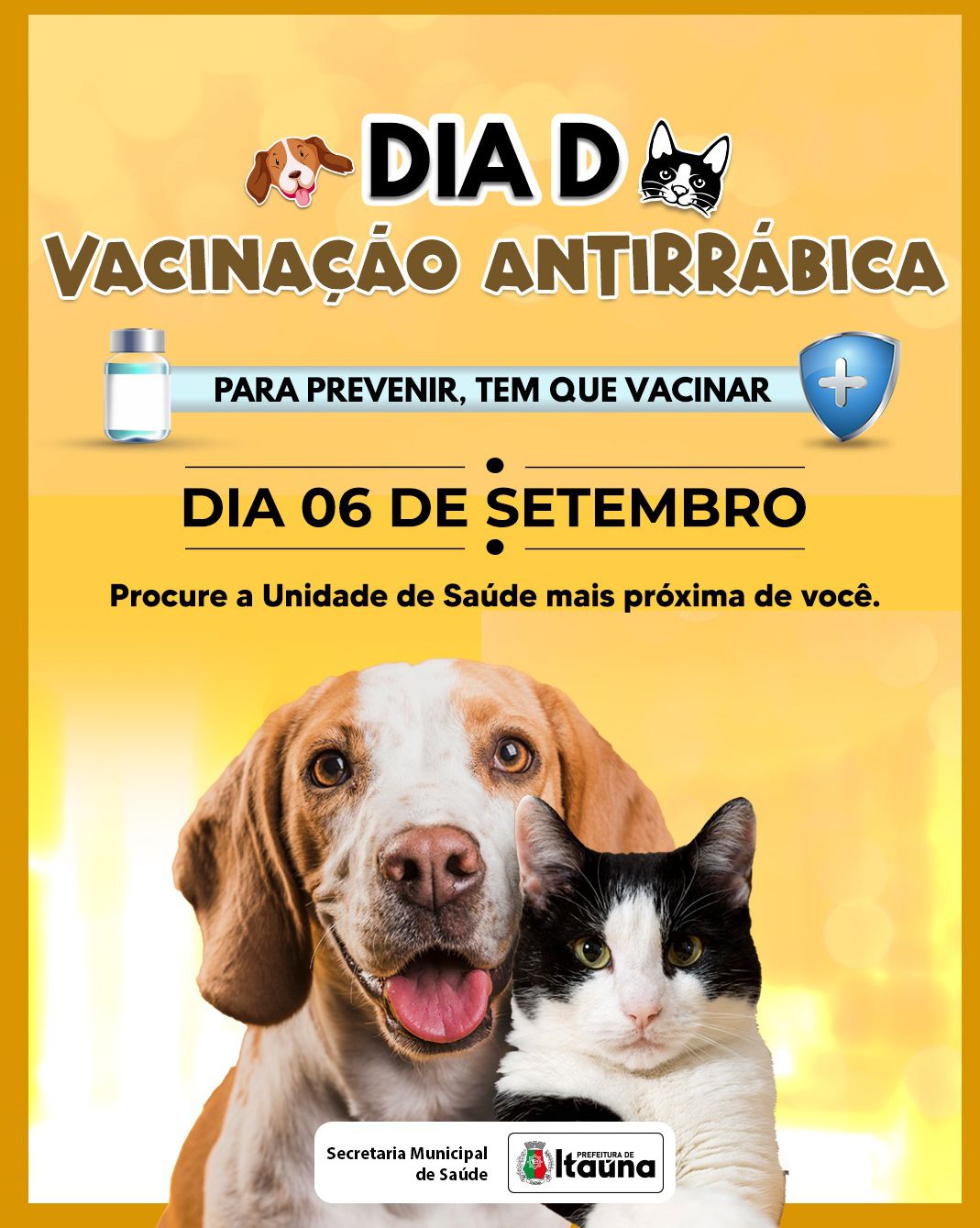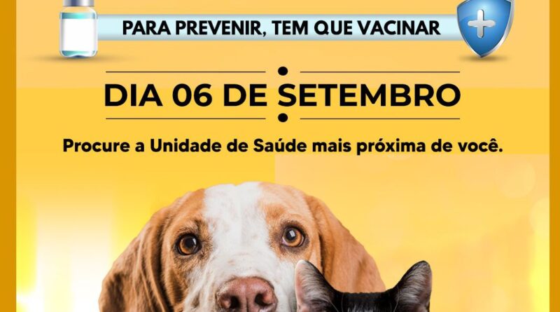Donos de cães e gatos tem um compromisso com a saúde dos seus pets neste sábado, 06/09. A Prefeitura de Itaúna, por meio da Secretaria Municipal de Saúde, realizará o Dia D da campanha de vacinação antirrábica. Todas as unidades de saúde da zona urbana estarão abertas para a imunização dos bichinhos, das 8h às 16h. Além das ESF’s, haverá tendas como ponto
