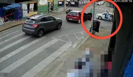 As imagens de uma câmera de segurança registraram quando os policiais chegam em uma viatura vermelha descaracterizada, param o veículo em frente ao carro branco roubado pela dupla, impedindo que os suspeitos fugissem.