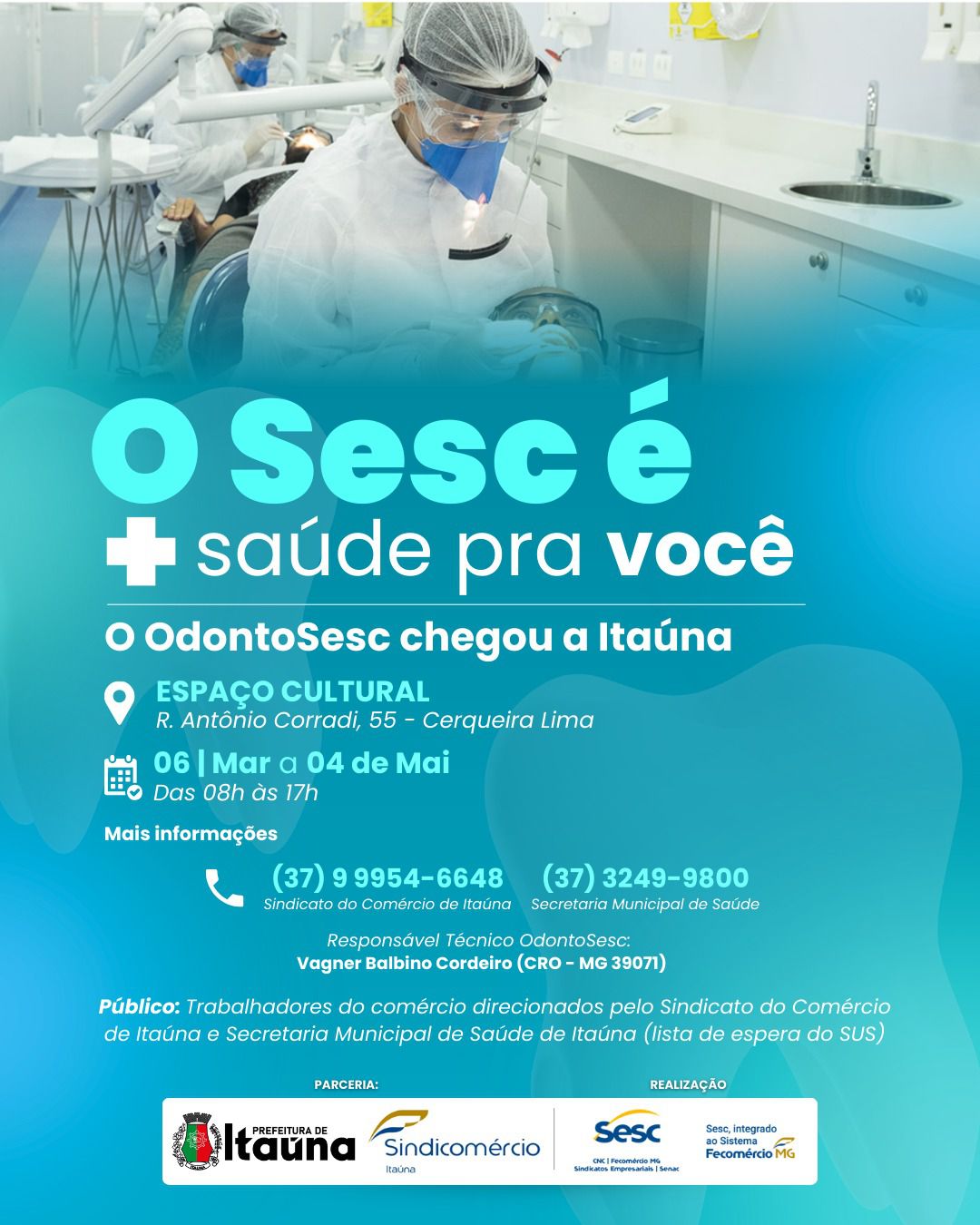 A Prefeitura, em parceria com o Sistema Fecomércio MG, por meio do Sesc em Minas, e o Sindicato do Comércio de Itaúna, recebe na cidade o projeto itinerante OdontoSesc, que oferecerá cerca de 1.300 tratamentos odontológicos gratuitos. Os atendimentos são direcionados a trabalhadores do comércio de bens, serviços e turismo, seus dependentes e também à comunidade inscrita na lista de espera da Secretaria Municipal de Saúde. A ação acontece de 06 de março a 04 de maio, de segunda a sexta-feira, das 8h às 17h, na unidade móvel instalada no Espaço Cultural, localizado na Rua Antônio Corradi, nº 55, no bairro Cerqueira Lima.