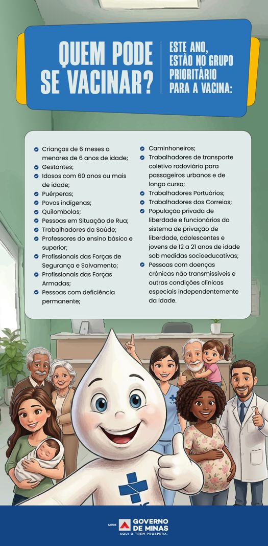 A vacinação é destinada aos grupos prioritários definidos pelo Ministério da Saúde, com destaque para crianças de 6 meses a menores de 6 anos, gestantes, idosos com 60 anos ou mais e puérperas. Também fazem parte do público-alvo povos indígenas e quilombolas, pessoas em situação de rua, trabalhadores da saúde e da educação, profissionais das forças de segurança e salvamento, além de pessoas com comorbidades e deficiência permanente.