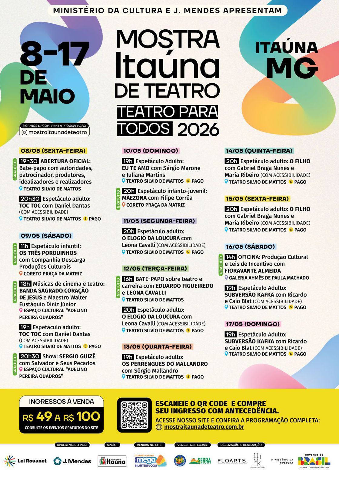 A cidade de Itaúna recebe, entre os dias 8 e 17 de maio, uma ampla programação dedicada à arte e à cultura com a realização da Mostra Itaúna de Teatro | Teatro para Todos’. Ao todo, serão 14 atrações, incluindo espetáculos teatrais, shows musicais, encontros com artistas e atividades formativas, contemplando públicos de diferentes faixas etárias.