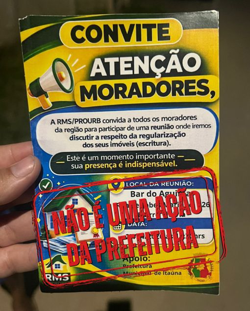 A Prefeitura de Itaúna informa que a ação divulgada por meio de convite que circula entre moradores do bairro Vitória, referente à realização de reunião para tratar de regularização de imóveis, não é uma iniciativa do município.