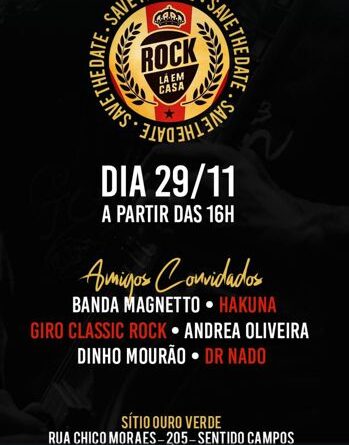 O programaço deste sábado é o” Rock Lá em Casa”, a partir das 16 horas, no sítio Ouro Verde, de nosso amigo Alisson Viana “Ratinho”, à rua Chico Morais, 205 – sentido Campos.